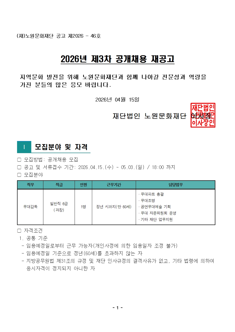 [재단법인노원문화재단] 노원문화재단 2026년 제3차 공개채용 재공고