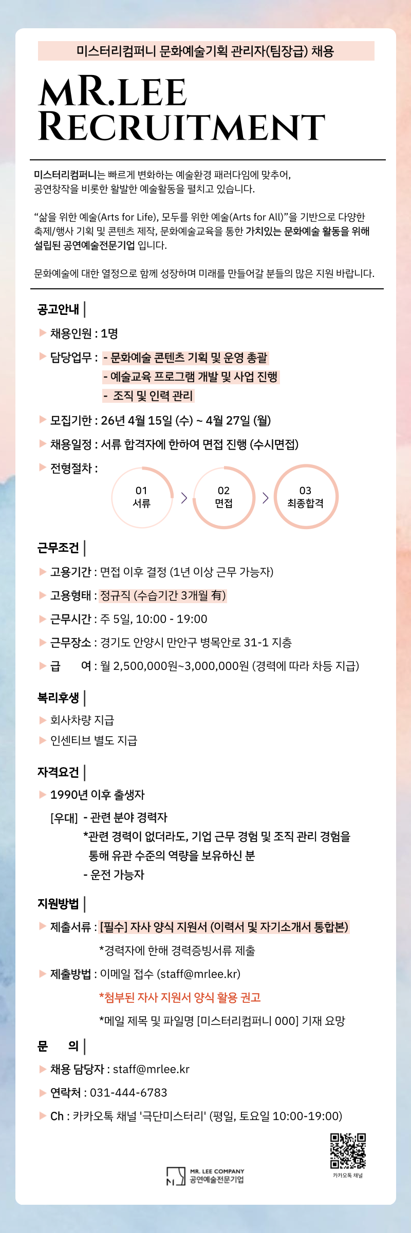 [미스터리컴퍼니] [미스터리컴퍼니] 2026 문화예술기획 관리자(팀장급) 모집