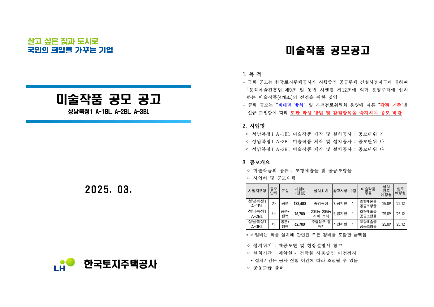 [예술경영지원센터(공모/기금/행사)] 2025 LH 위례사업본부 공동주택 미술작품 제작 및 설치 공모 공고