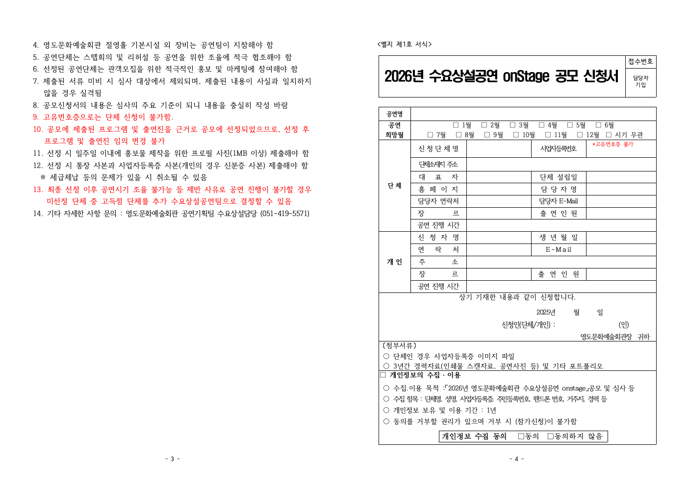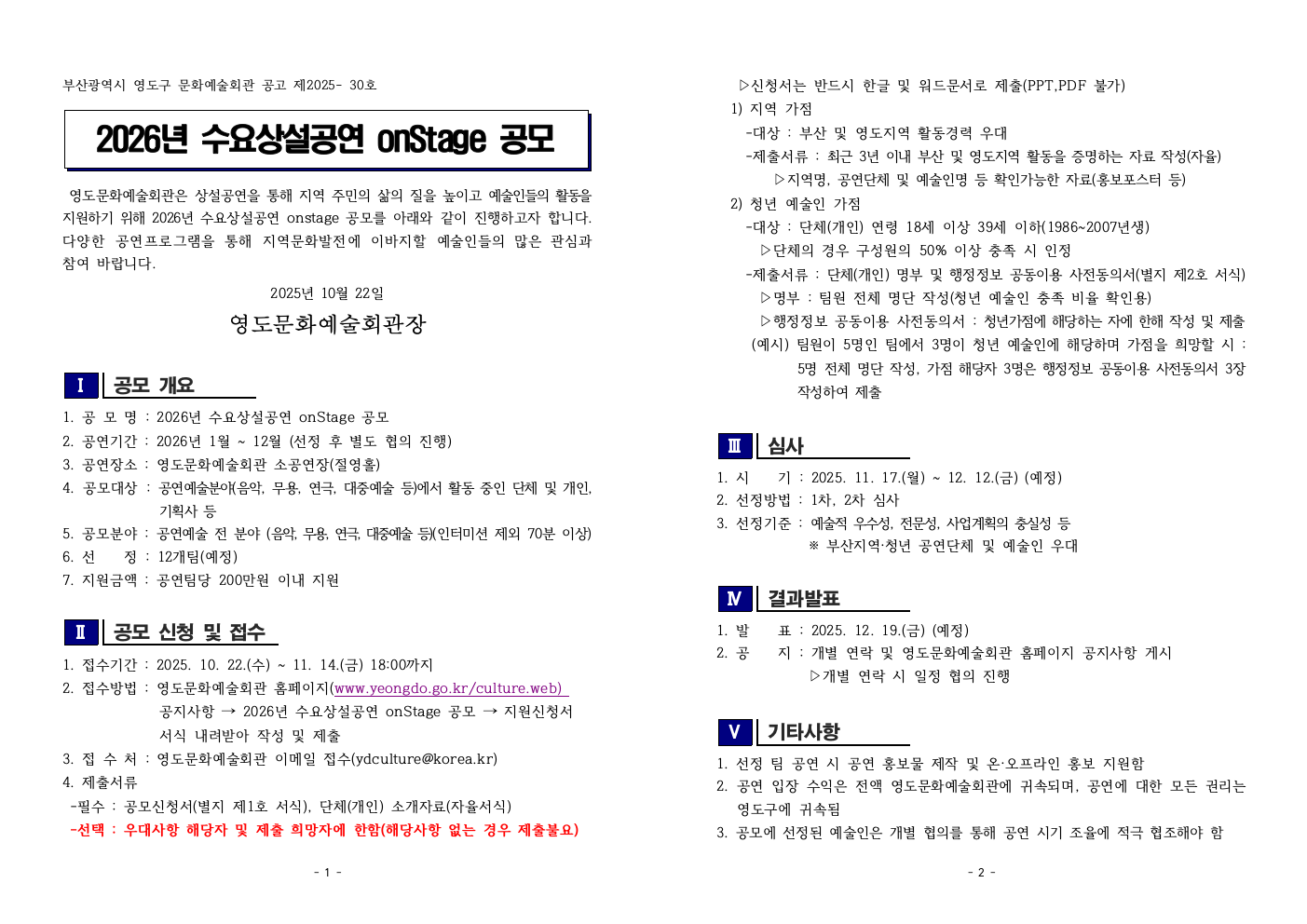 [예술경영지원센터(공모/기금/행사)] 2026 영도문화예술회관 수요상설공연 onstage 공연공모