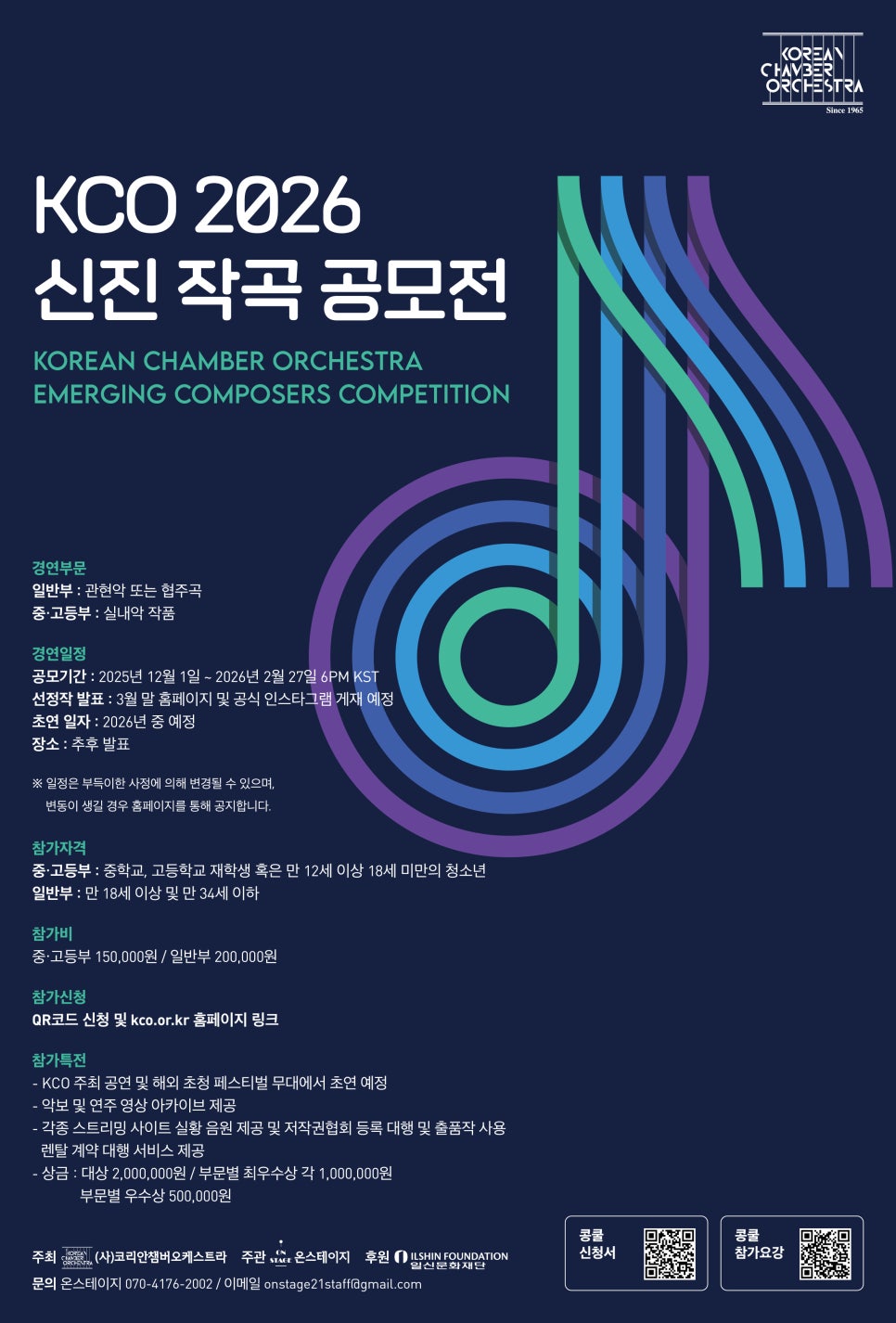 선정작의 경우 해당 곡과 관련된 저작권은 향후 1년간 주최 측에 귀속되며, 이는 KCO 작곡 콩쿨 위너 콘서트 연주 실황 저작권을 포함합니다.