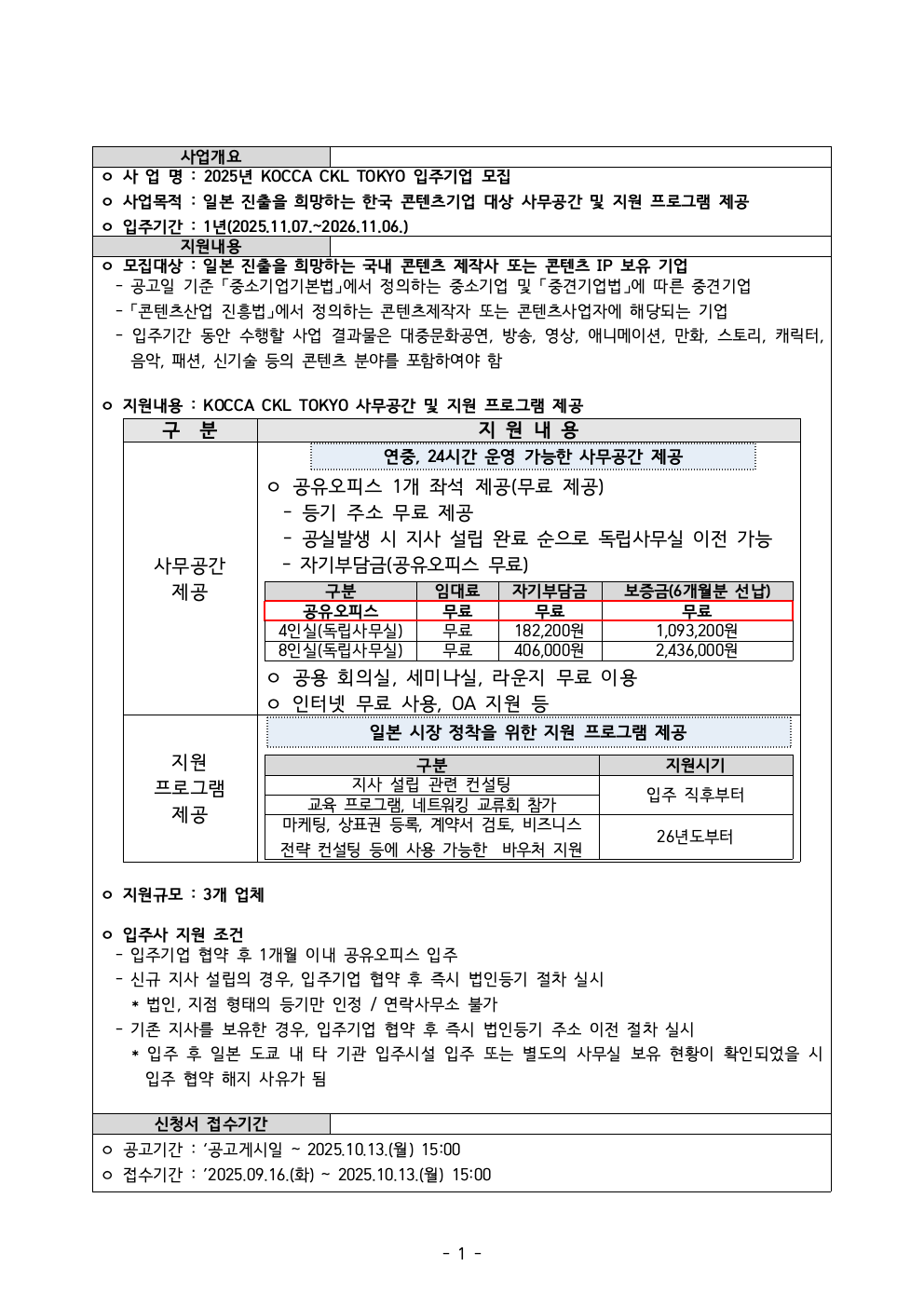 20250917061015_1. (공고문) 2025년 KOCCA CKL TOKYO 입주기업 모집.hwp