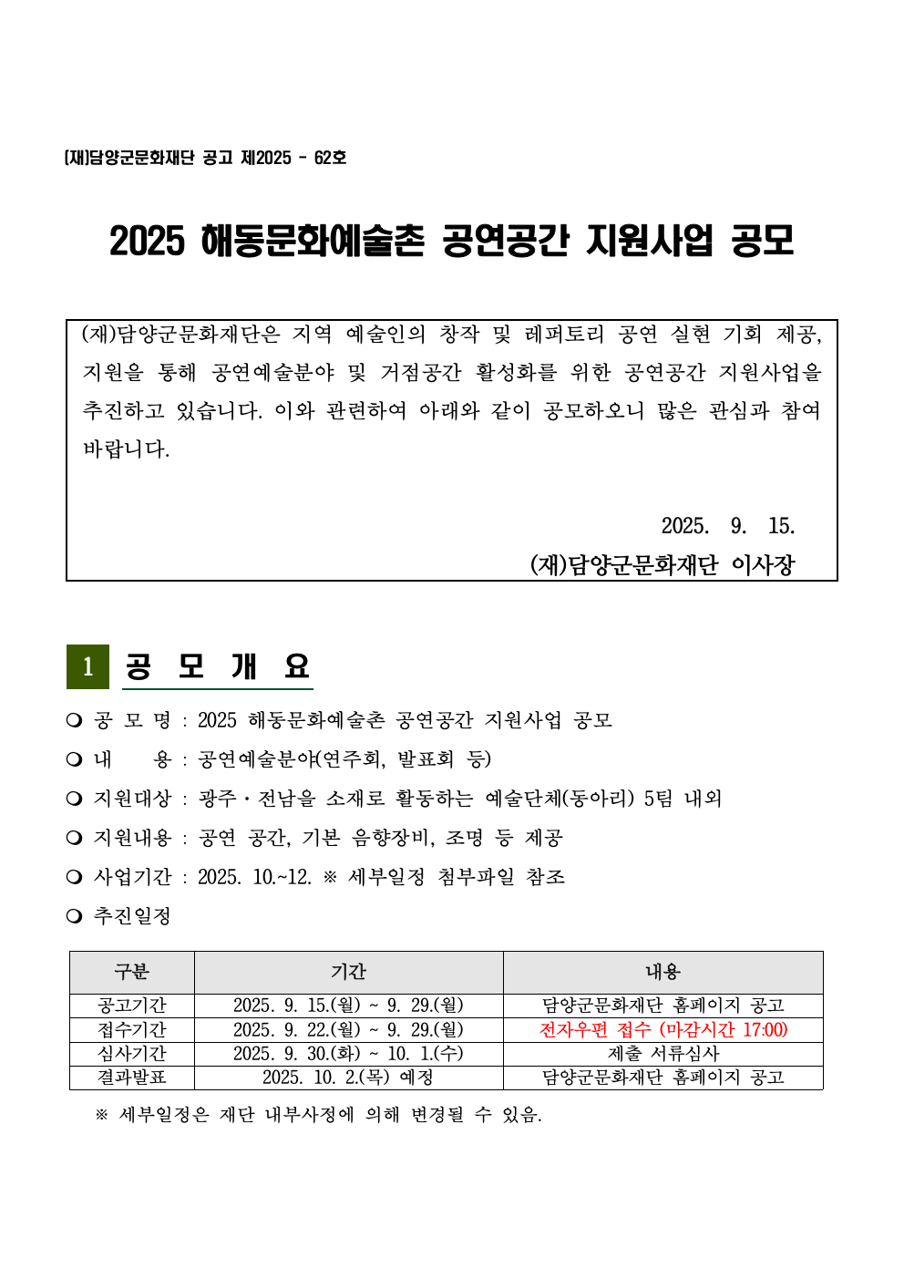 [담양군문화재단] 2025 해동문화예술촌 공연공간 지원사업 공모