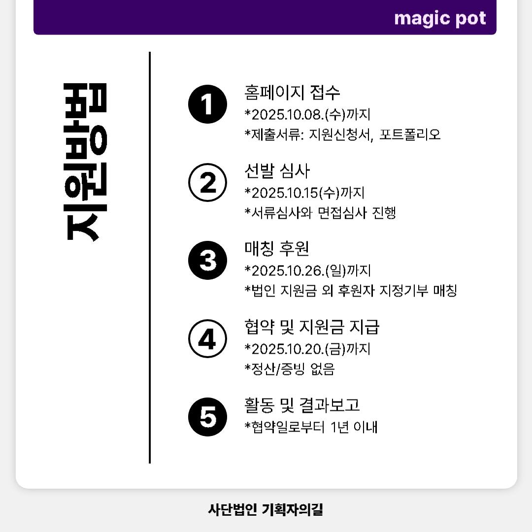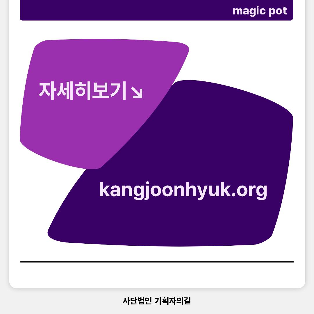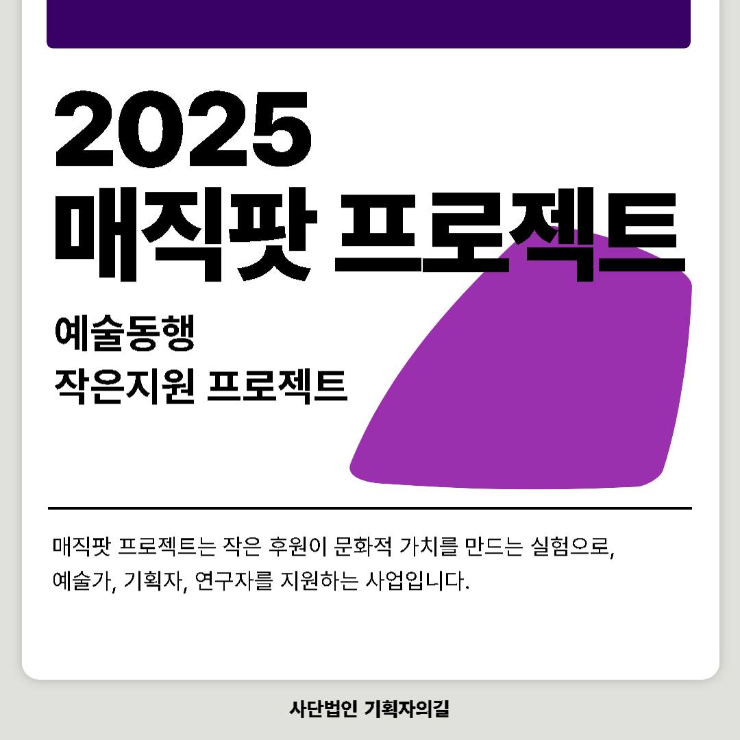 사단법인 기획자의길은 한국 예술과 문화 현장에서 창의적 문화기획의 길을 열고 우리 문화를 세계에 알렸던 강준혁 선생의 정신을 이어받아, 우리 사회의 문화와 기획이 창의성과 공익성을 유지하는데 기여하는 사업으로 <예술동행 작은지원 프로젝트 “매직팟(Magic Pot)”>을 시작합니다.