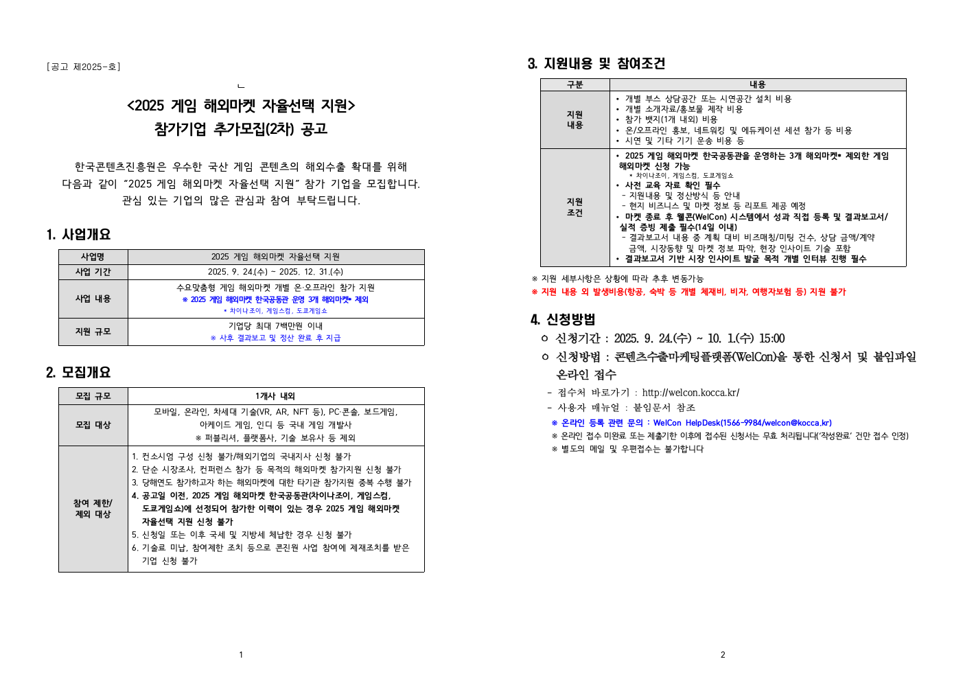 20250924104047_[공고문] 2025 게임 해외마켓 자율선택 지원 참가기업 모집공고(2차 추가모집).hwp