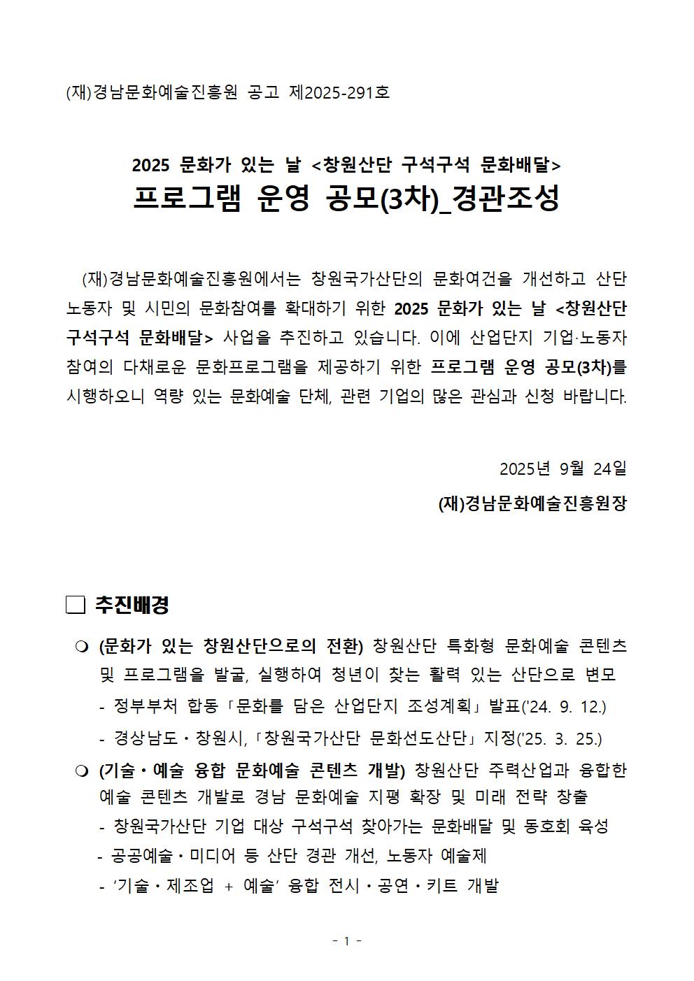 [경남문화예술진흥원] 2025 문화가 있는 날 <창원산단 구석구석 문화배달> 프로그램 운영 공모(3차)_경관조성