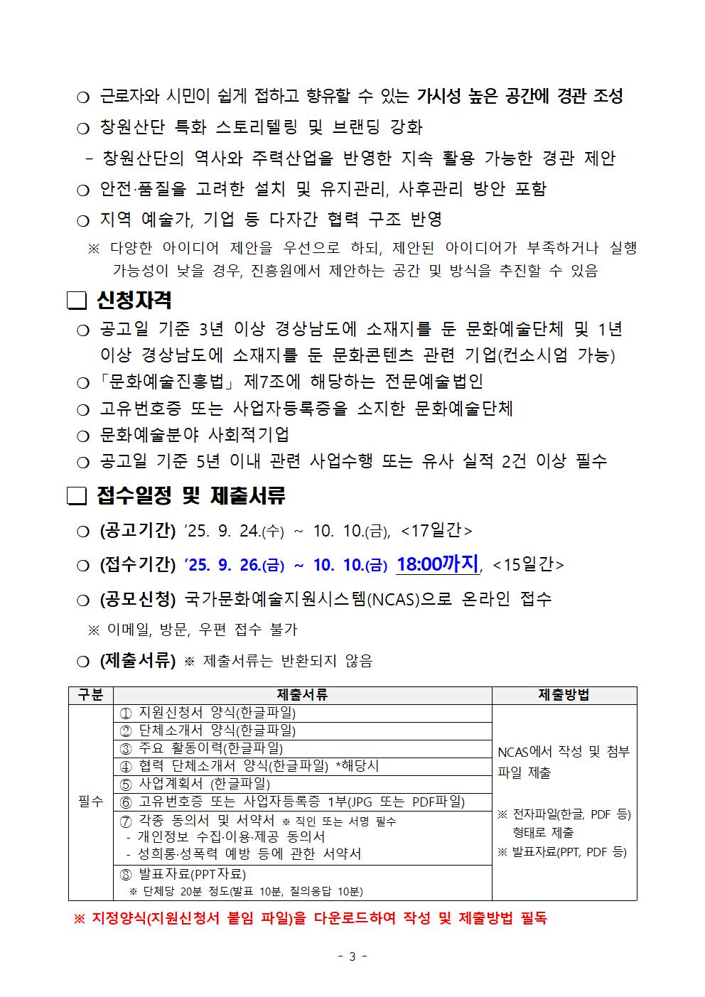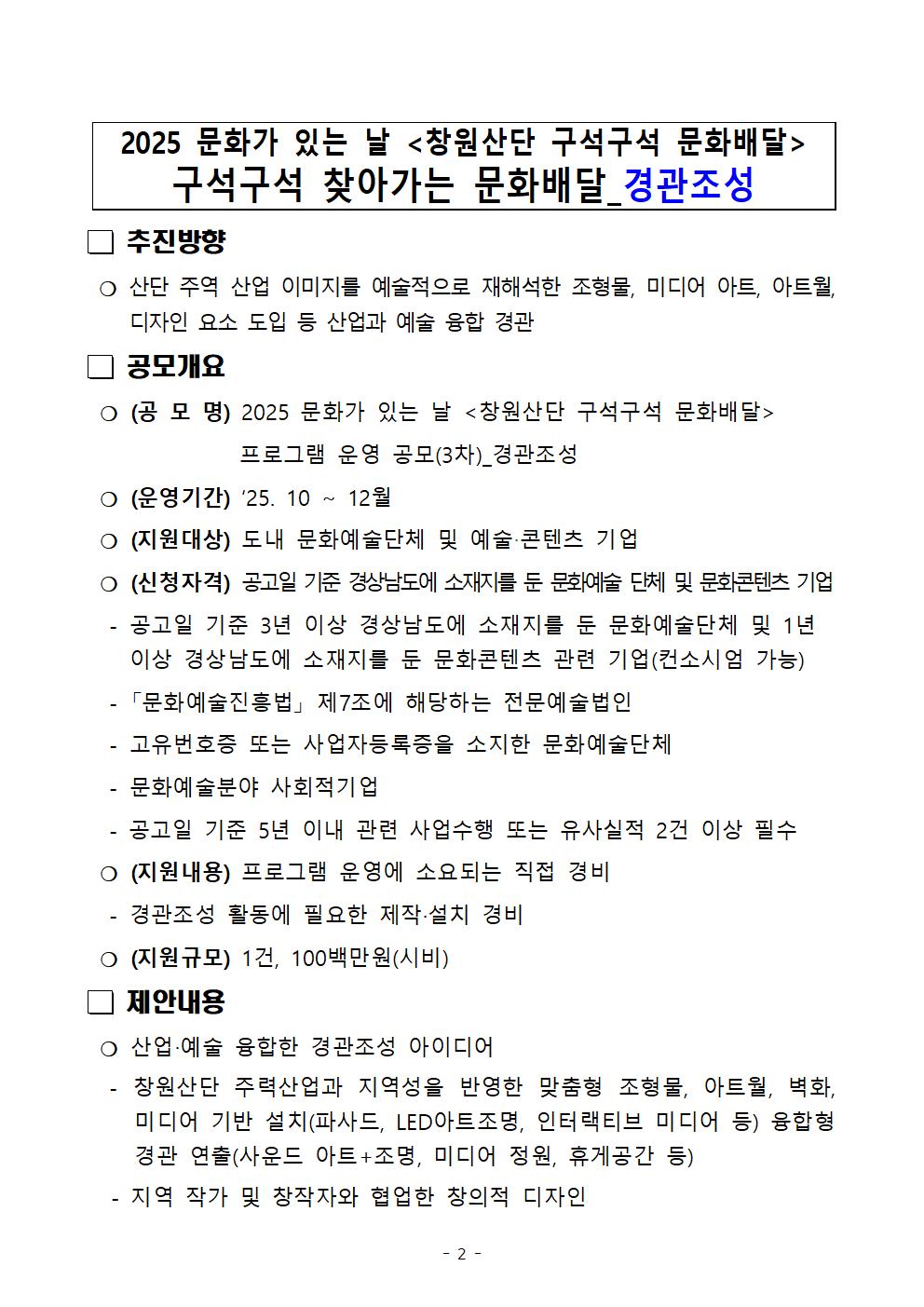 20250925105100_붙임 1. [공고문] 창원산단 구석구석 문화배달 프로그램 운영 공모3차_경관조성 공고문.hwp