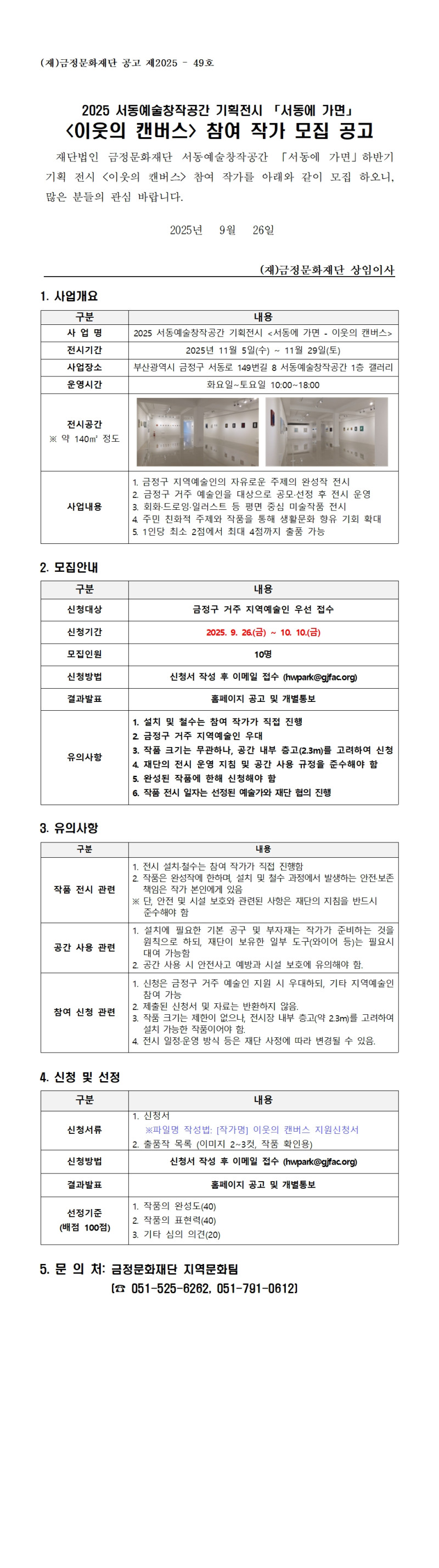 [금정문화재단] 2025년 서동예술창작공간 기획전시 서동에 가면 <이웃의 캔버스> 참여 작가 모집