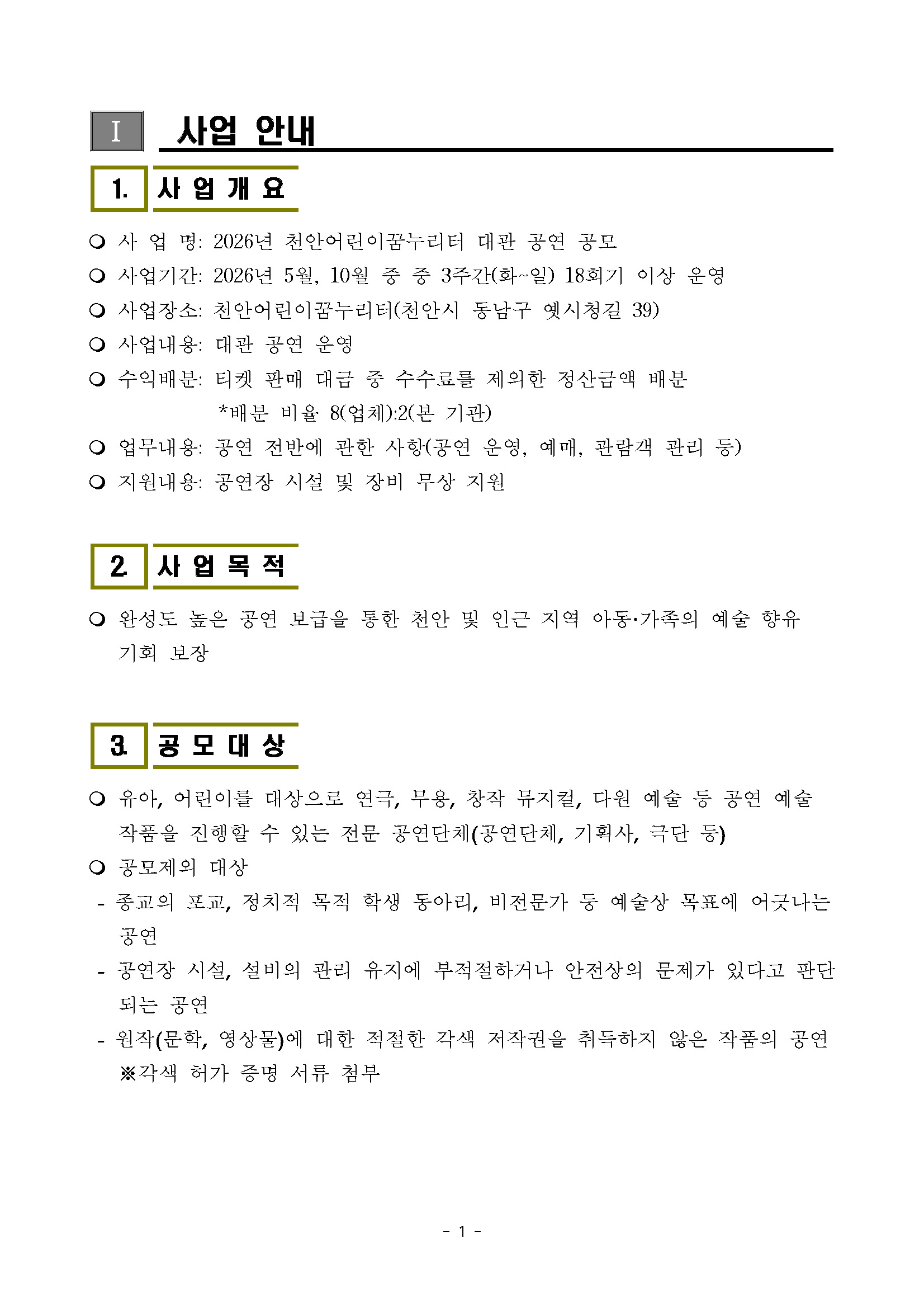 [예술경영지원센터(공모/기금/행사)] 천안어린이꿈누리터 2026년도 공연 공모