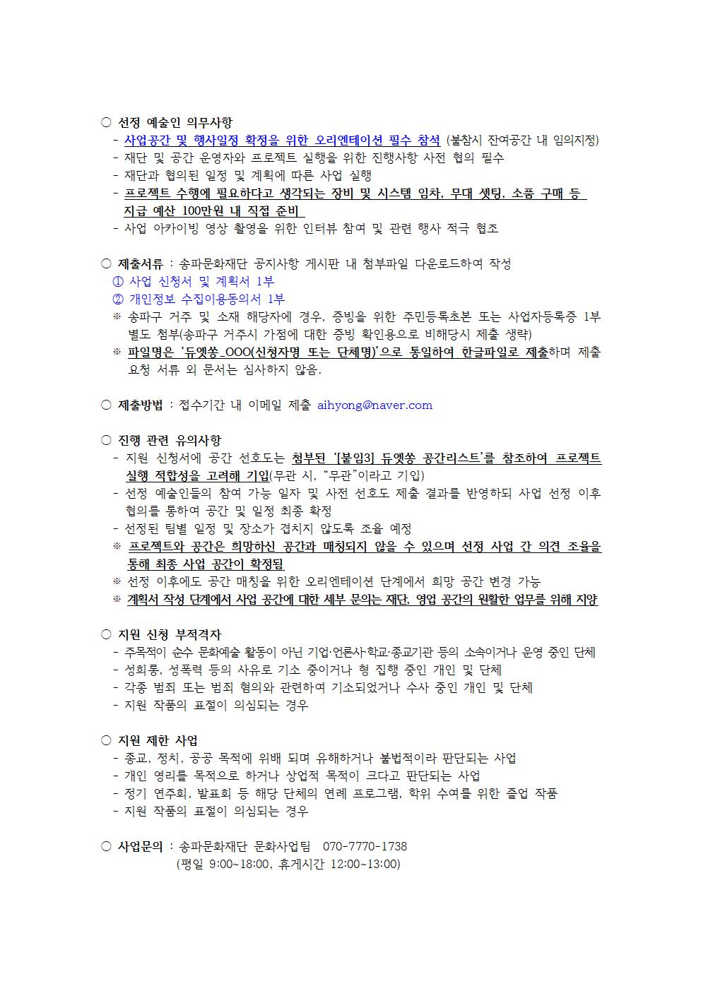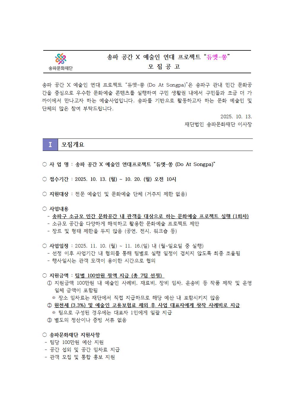 [송파문화재단] [회원등록공고] [모집] 송파공간x예술인 연대프로젝트 <듀엣쏭> 참여 예술인 모집 (10.13~10.20 오전10시)
