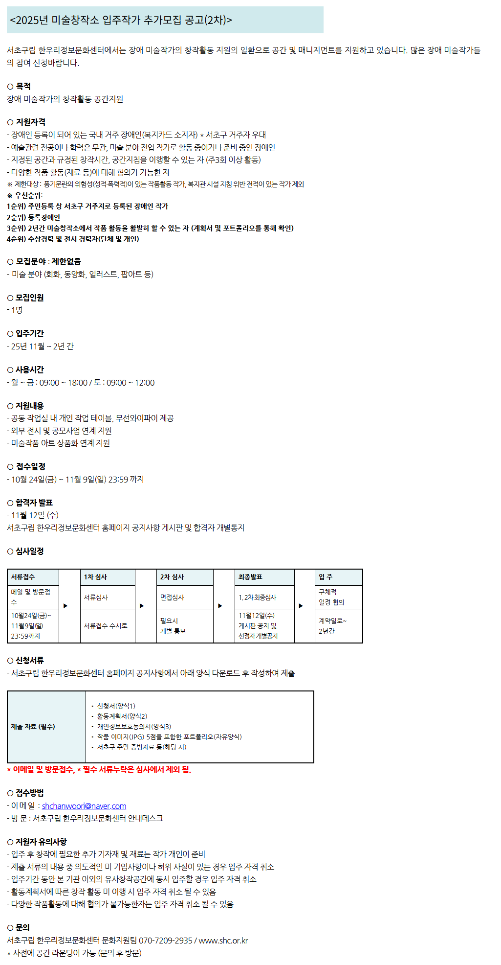 [서초구립 한우리정보문화센터] <2025년 미술창작소 입주작가 모집 (2차) 추가모집 공고>