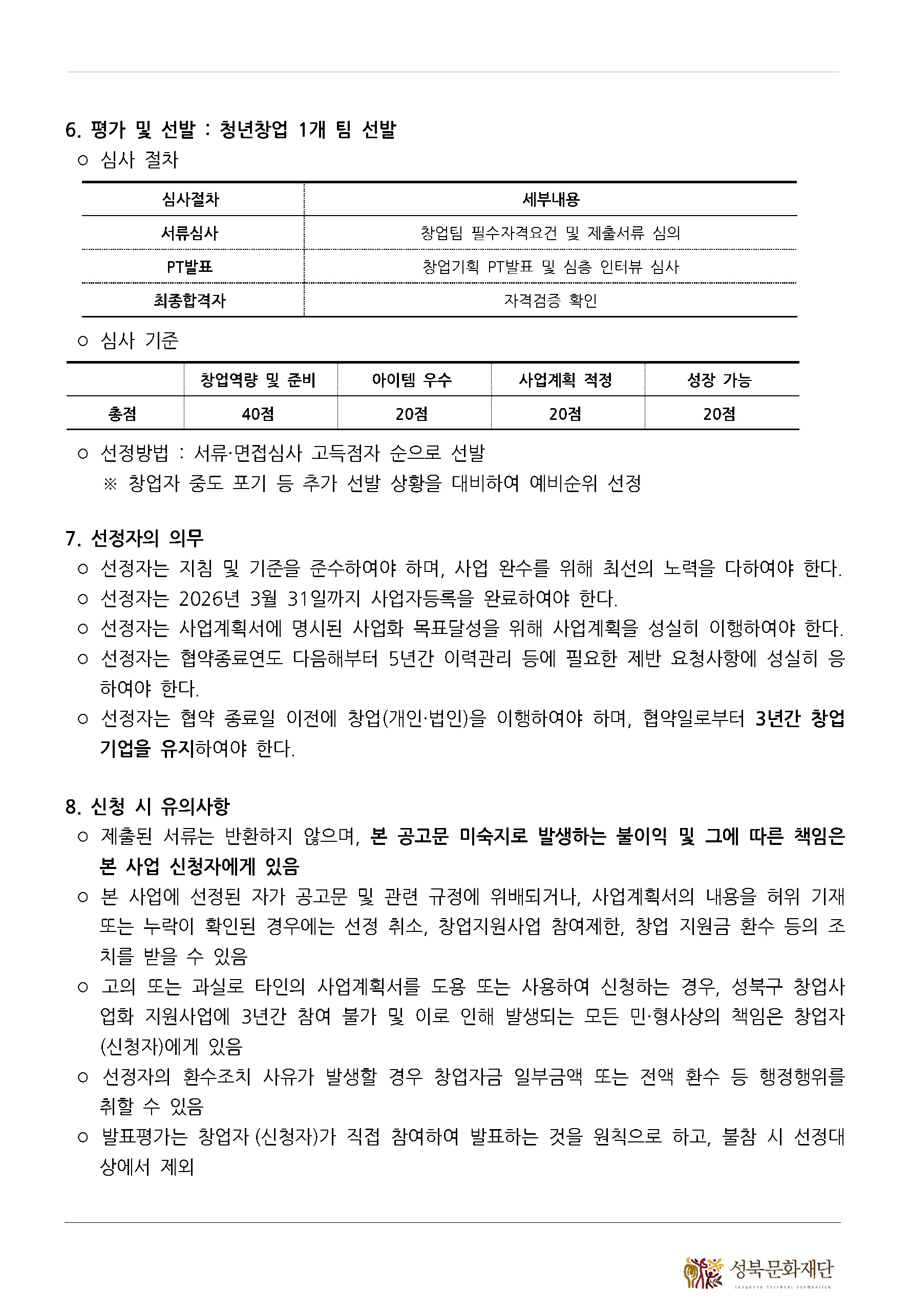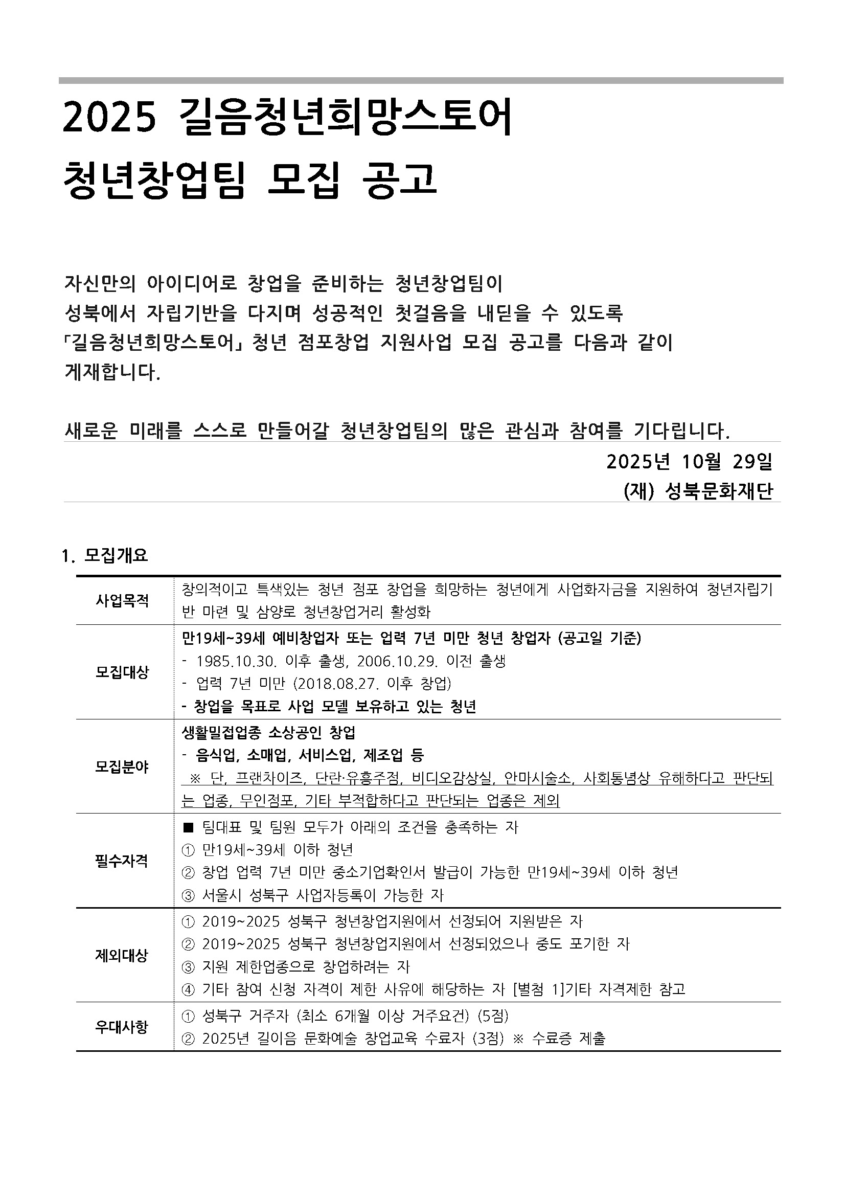 [성북문화재단] [청년가게 10호점 모집] 2025년 길음청년희망스토어 청년창업 지원사업 _청년창업팀 모집 공고