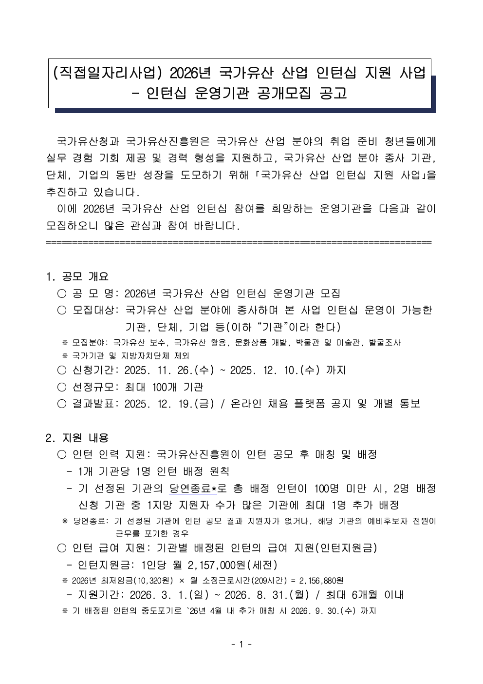 [국가유산진흥원] 2026년 국가유산 산업 인턴십 지원 사업 - 인턴십 운영기관 공개모집 공고