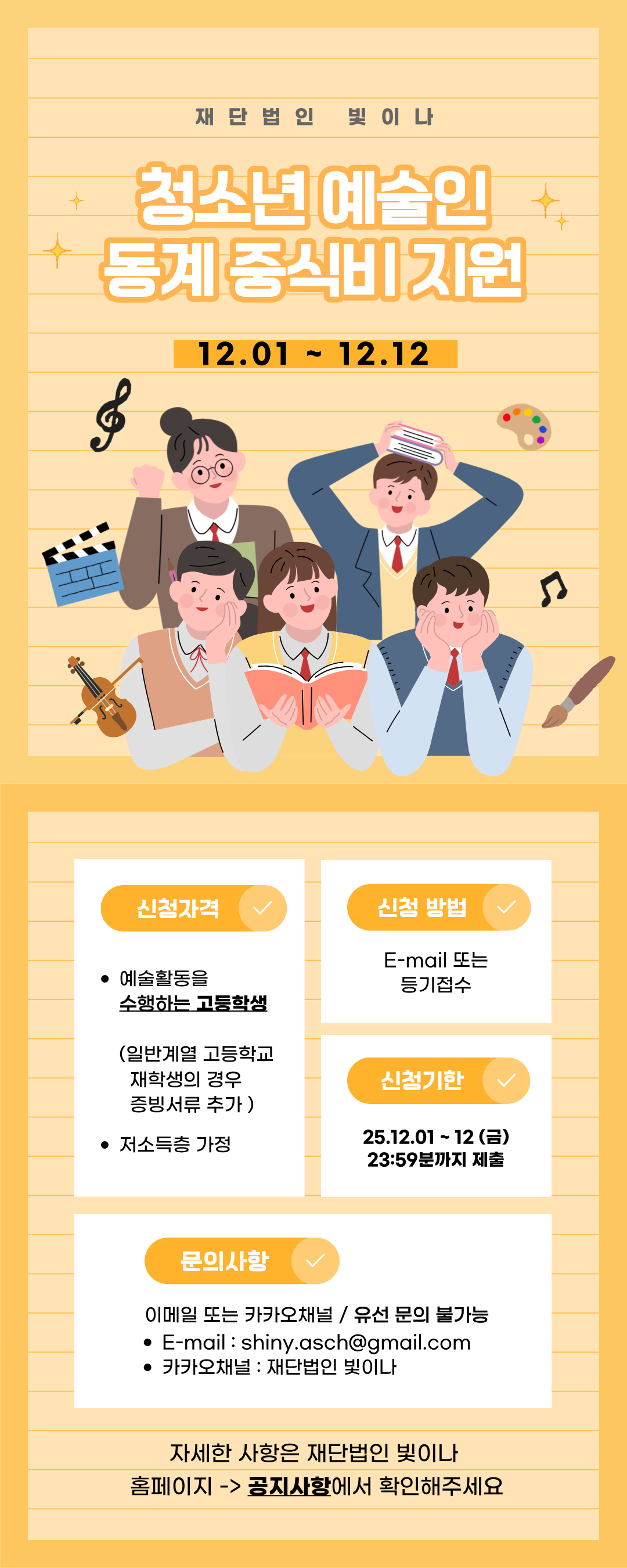 [재단법인 빛이나] [회원등록공고] [재단법인 빛이나] 청소년 예술인 동계 중식비 지원 (일반/예술계열 고등학교)