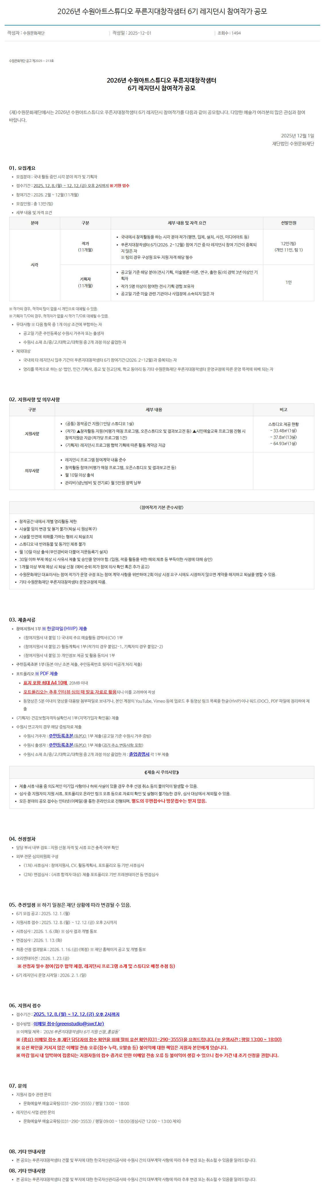[수원문화재단] 2026년 수원아트스튜디오 푸른지대창작샘터 6기 레지던시 참여작가 공모