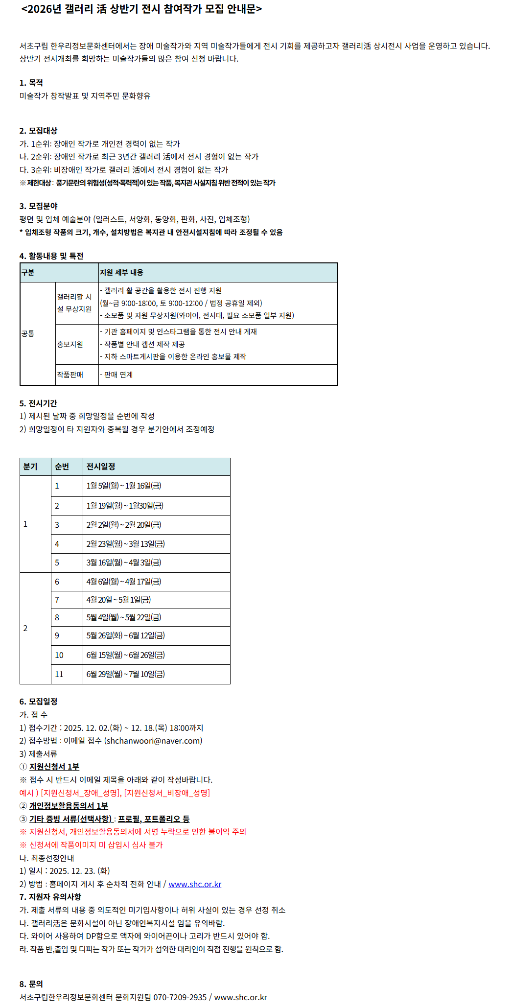 [서초구립 한우리정보문화센터] [모집] 2026년 갤러리活 상반기 전시 참여작가 모집