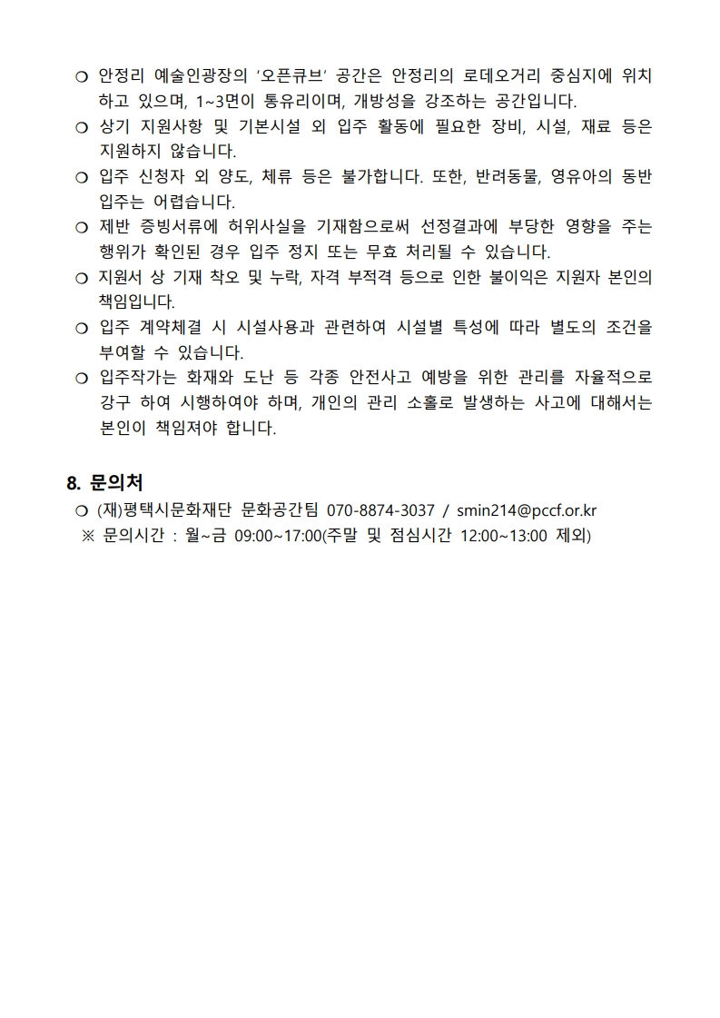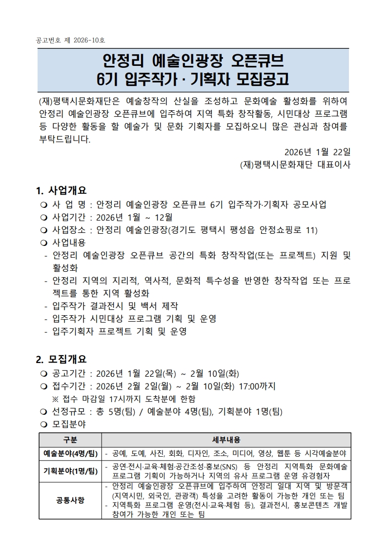 [평택시문화재단] 안정리 예술인광장 오픈큐브 6기 입주작가·기획자 모집 공고