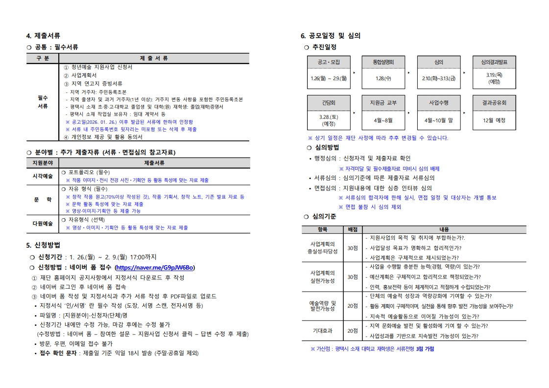 [평택시문화재단] 2026 평택시문화재단 청년예술 지원사업 공고