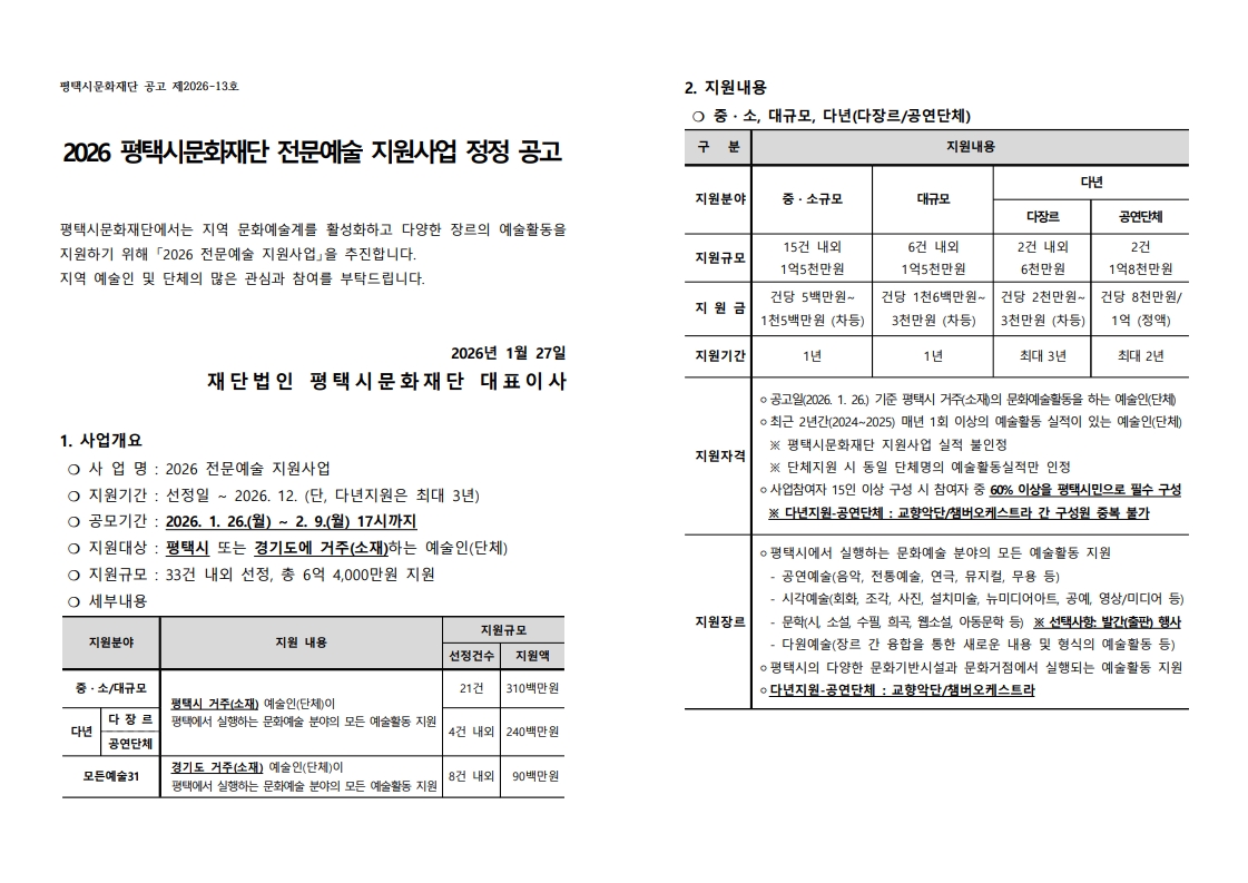 [평택시문화재단] 2026 평택시문화재단 전문예술 지원사업 정정 공고