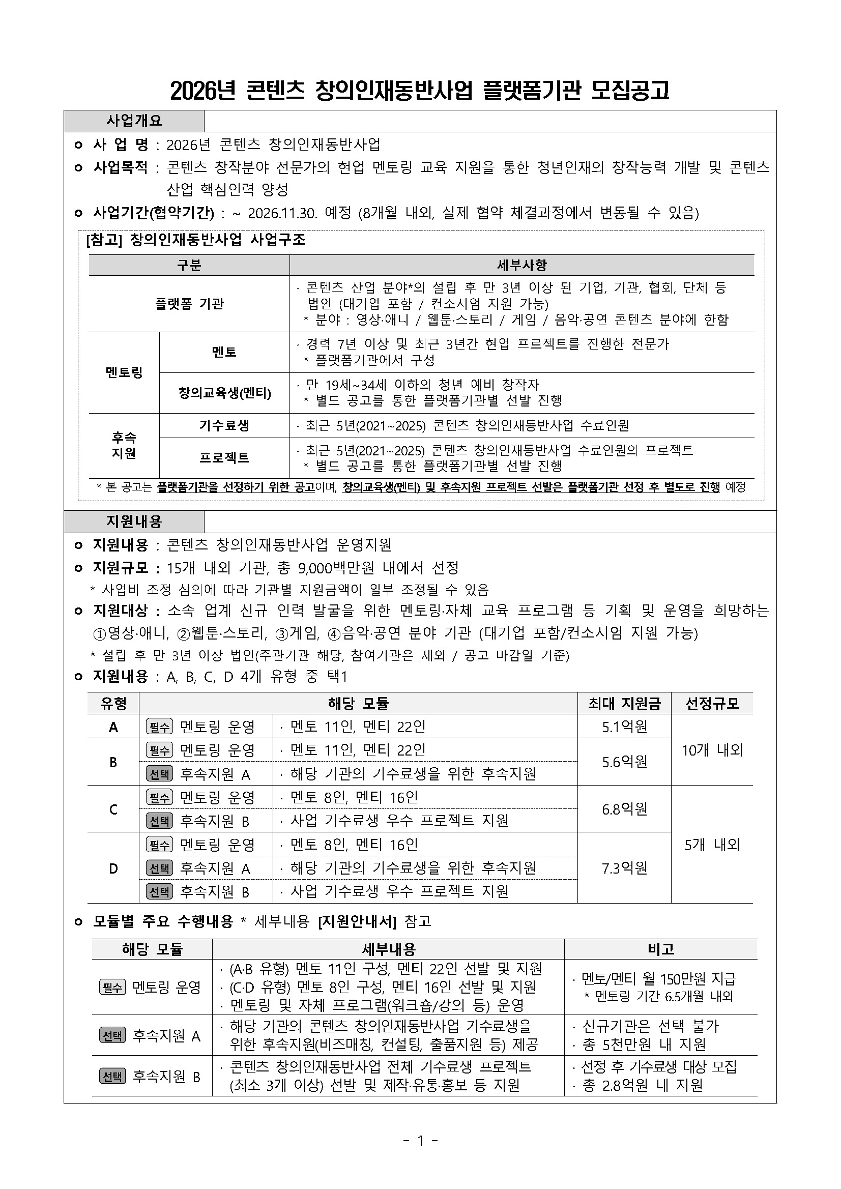 [한국콘텐츠진흥원] 2026년 콘텐츠 창의인재동반사업 플랫폼기관 모집공고