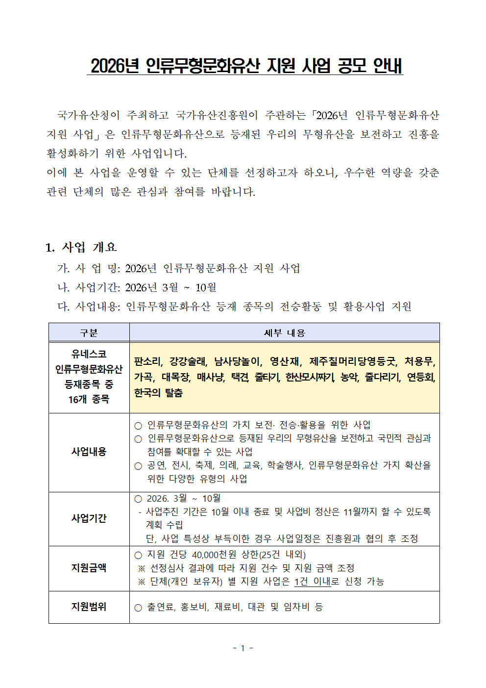 [국가유산청] 2026년 인류무형문화유산 지원 사업 공모 안내