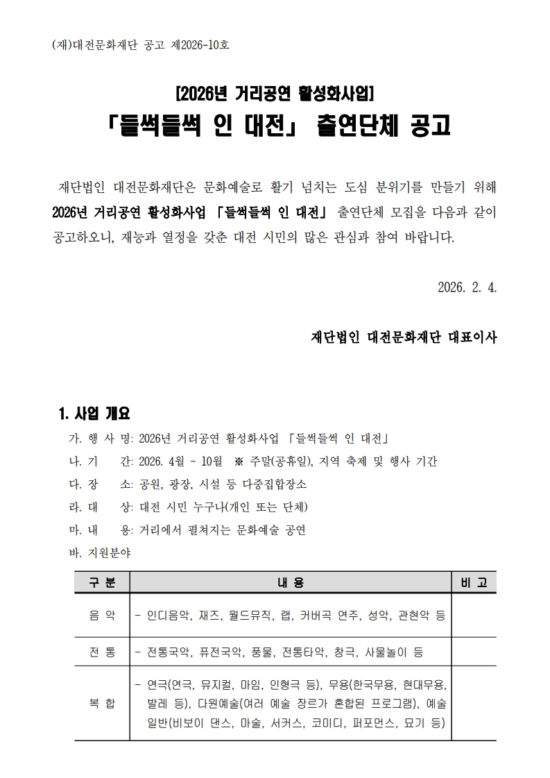 [대전문화재단] 2026년 거리공연 활성화사업 「들썩들썩 인 대전」 출연단체 공모