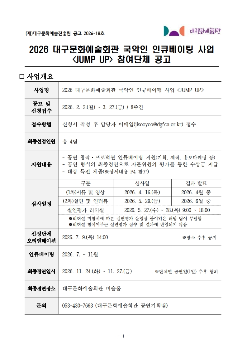 [대구문화예술진흥원] 2026 대구문화예술회관 국악인 인큐베이팅 사업 참여단체 공고