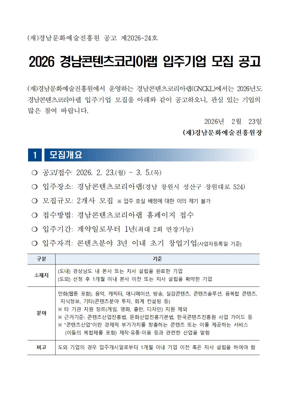 [경남문화예술진흥원] 2026 경남콘텐츠코리아랩 입주기업 모집 공고