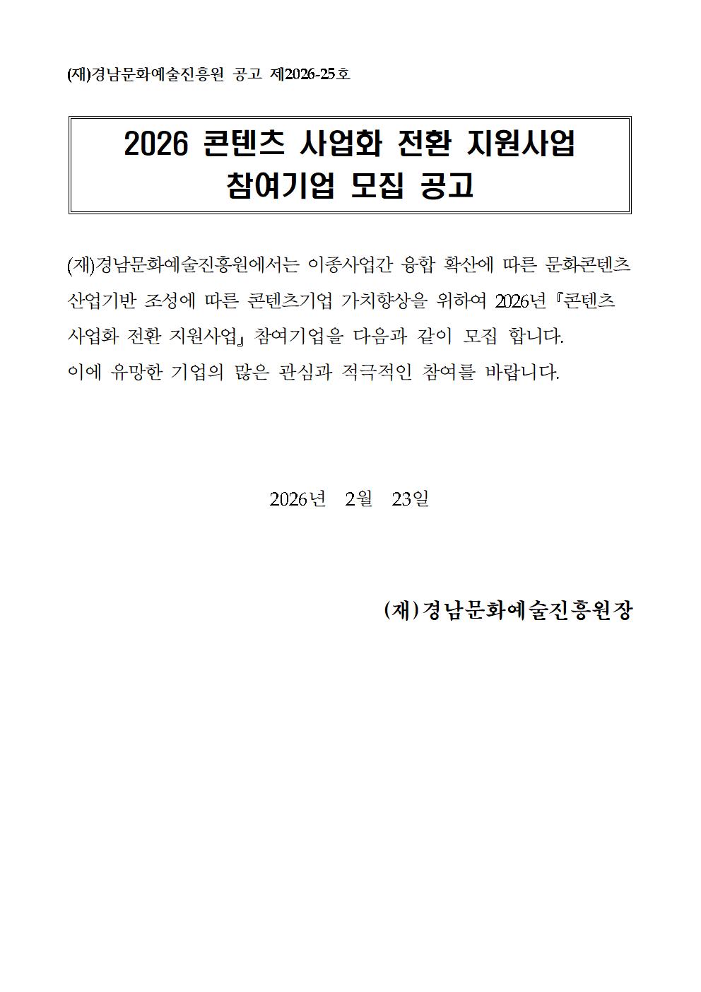 [경남문화예술진흥원] 2026 콘텐츠사업화 전환 프로그램 참여기업 모집 공고