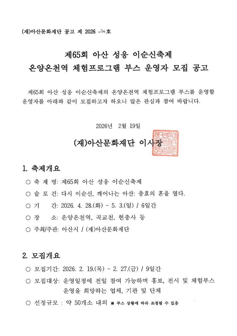 [아산문화재단] 온양온천역 체험프로그램 부스 운영자 모집 공고