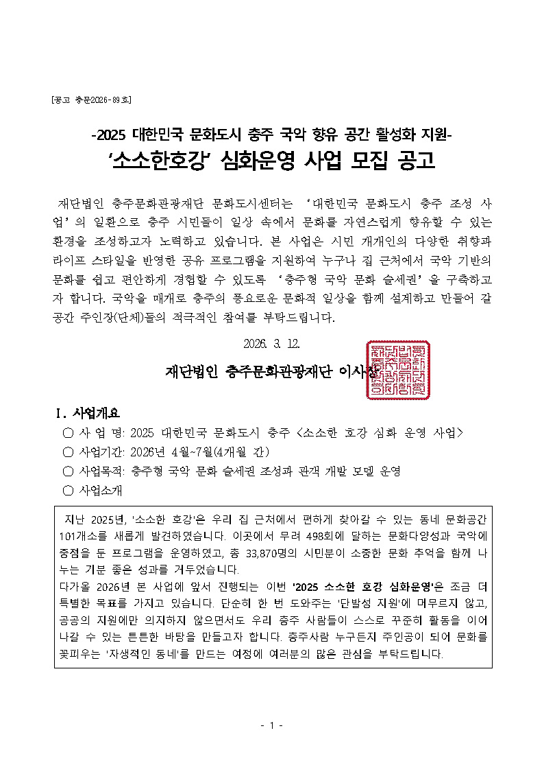 2025 대한민국 문화도시 충주 국악 향유 공간 활성화 지원 소소한 호강 심화운영 사업 모집 재공고