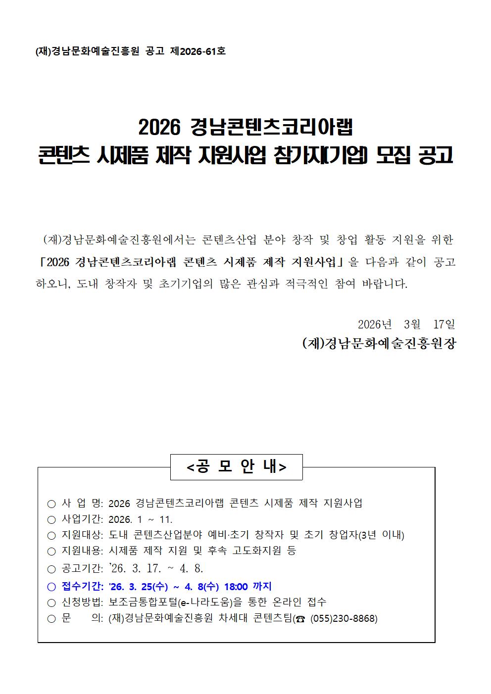 20260318024955_[공고문] 2026 경남콘텐츠코리아랩 「콘텐츠 시제품 제작 지원사업」 참가자기업 모집 공고 .hwp