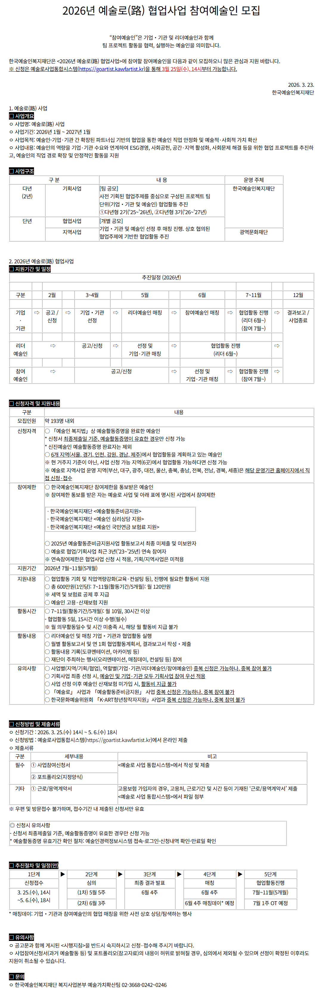 [한국예술인복지재단] [공고] 2026년 예술로(路) 협업사업 참여예술인 모집