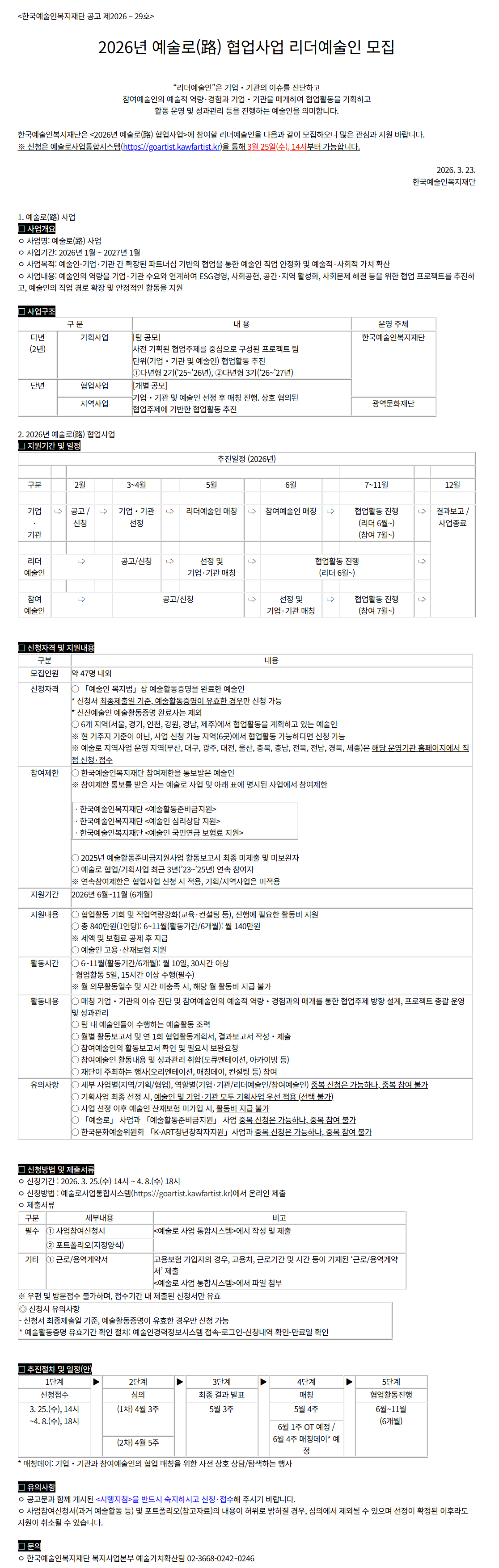 [한국예술인복지재단] [공고] 2026년 예술로(路) 협업사업 리더예술인 모집