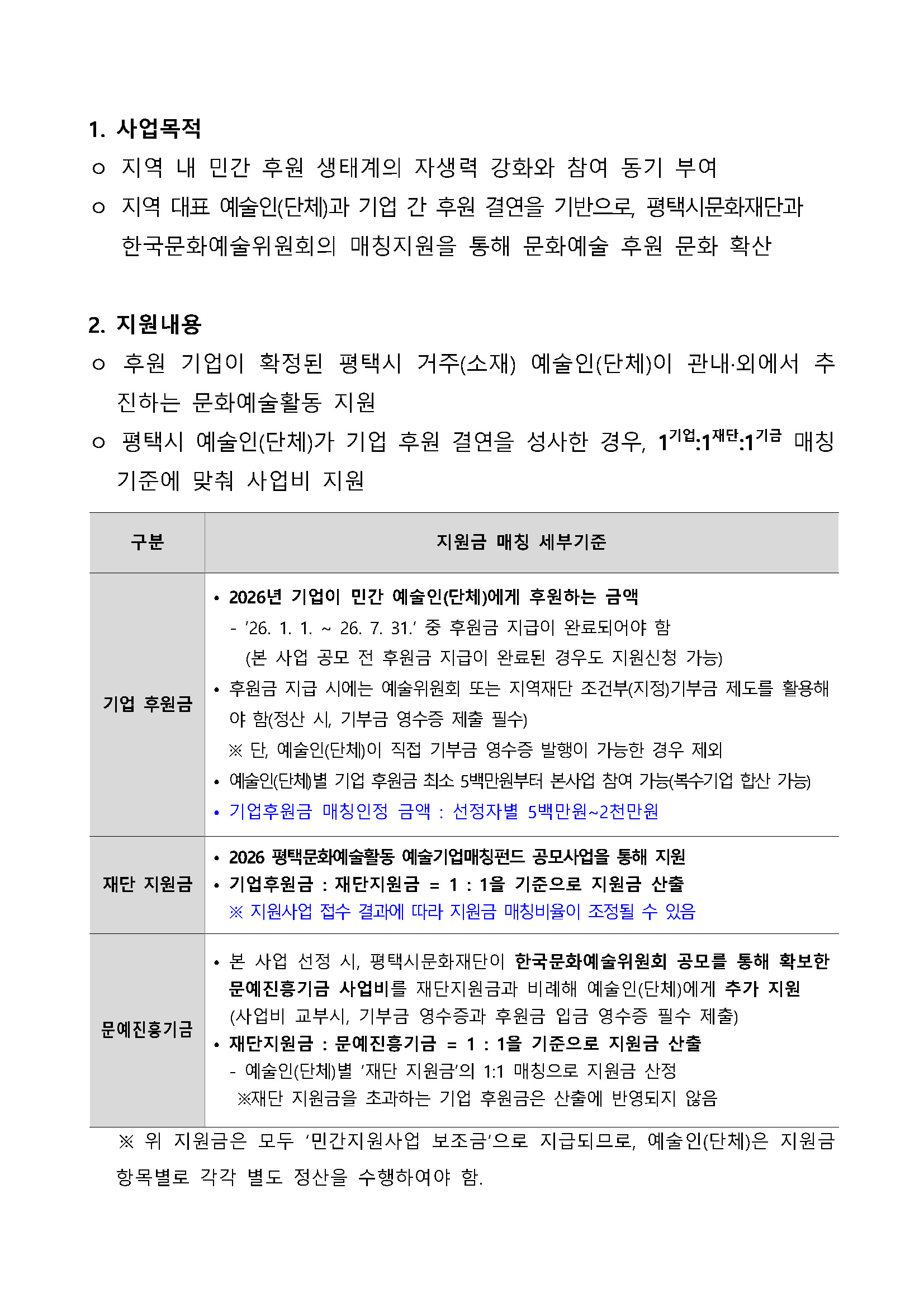 [평택시문화재단] 2026 평택문화예술활동 예술기업매칭펀드 지원사업 공모
