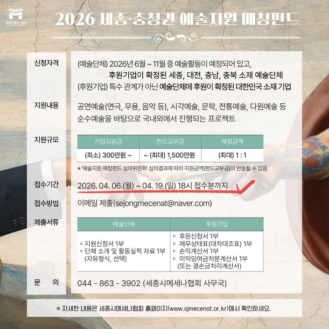 [세종시메세나협회] 「2026 세종·충청권 예술지원 매칭펀드」 사업 공고( ~ 4/19까지)