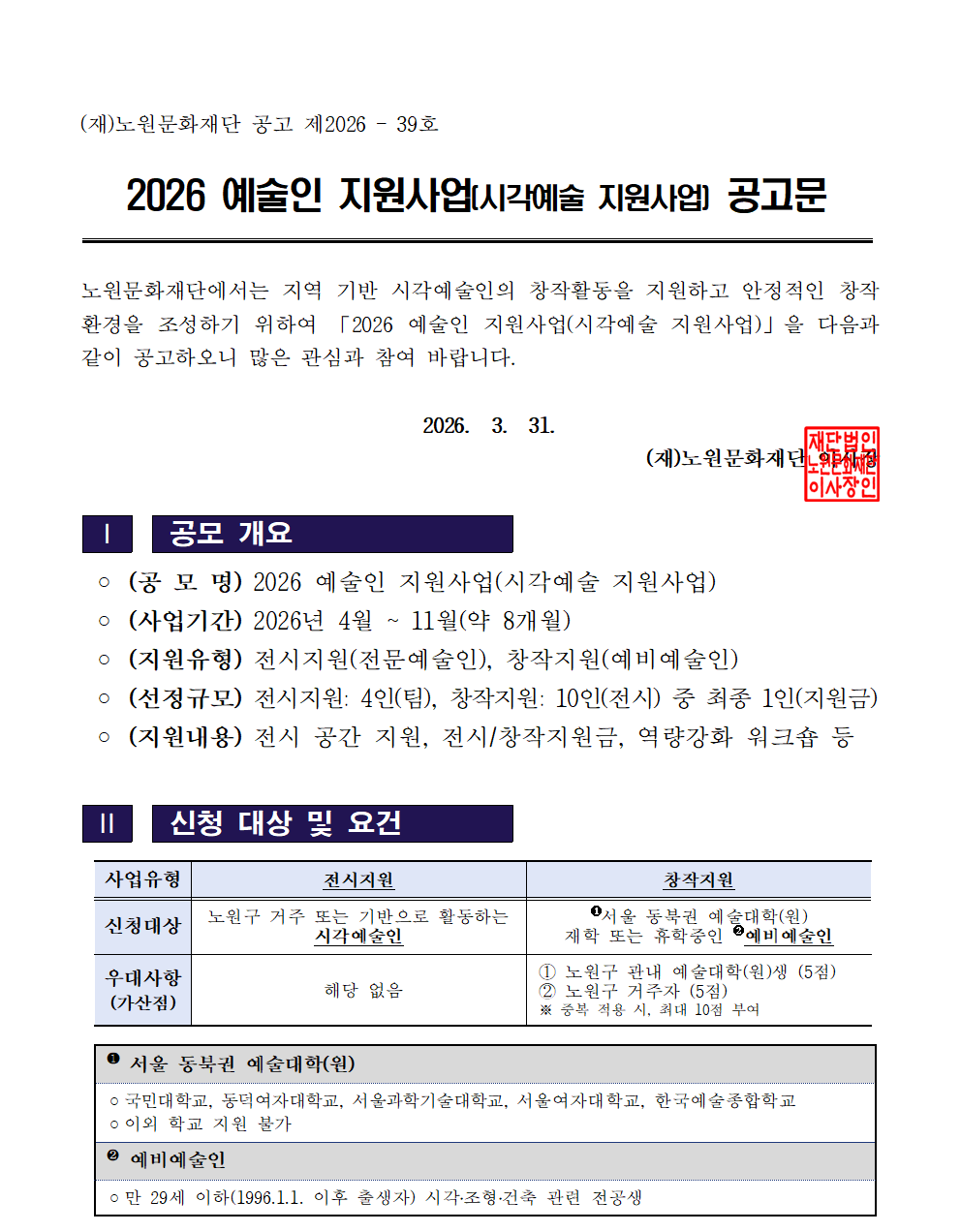 [노원문화재단] 2026 예술인 지원사업(시각예술 지원사업) 공모 (~4/24 18:00)