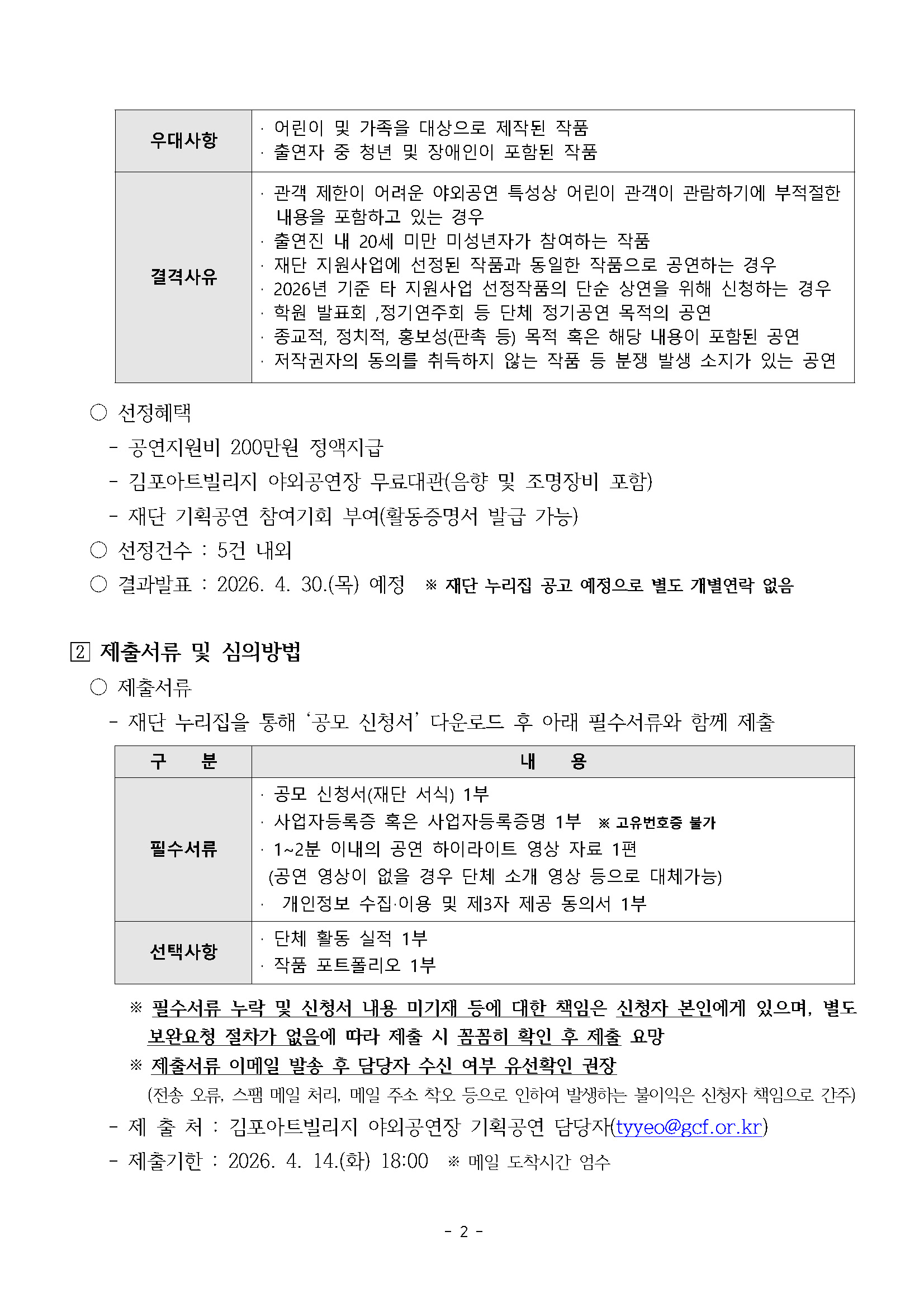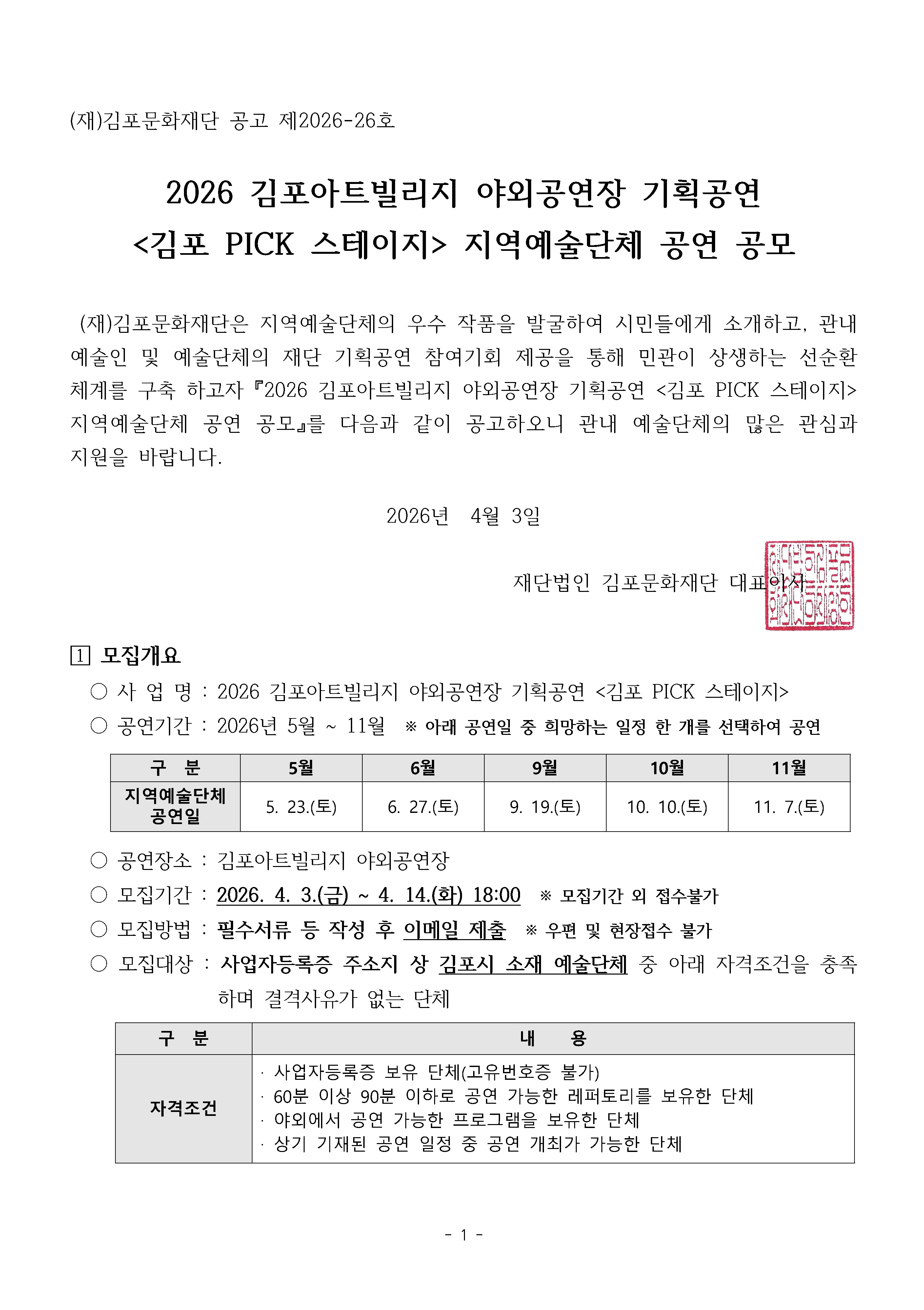 [김포문화재단] 2026 김포아트빌리지 야외공연장 기획공연 <김포 PICK 스테이지> 지역예술단체 공연 공모 공고