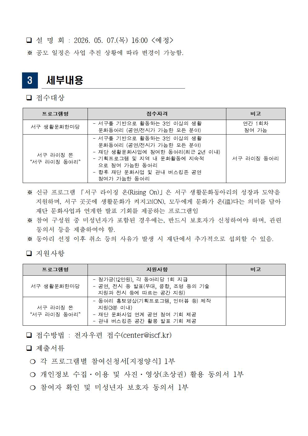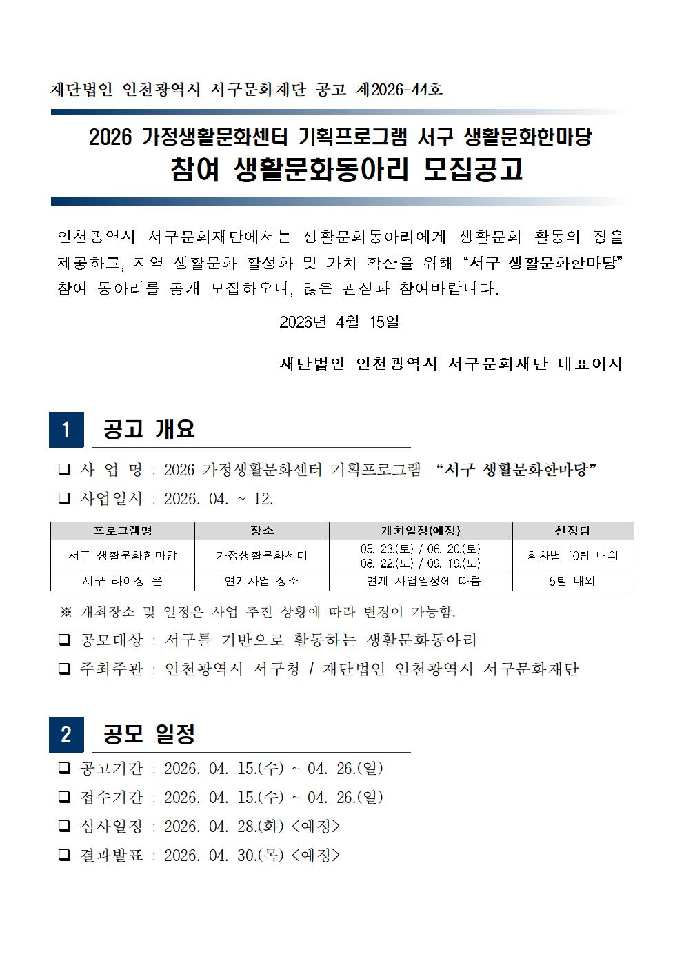 [인천서구문화재단] 2026 가정생활문화센터 기획프로그램 서구 생활문화한마당 참여 생활문화동아리 모집 공고 ※ 중복지원 가능