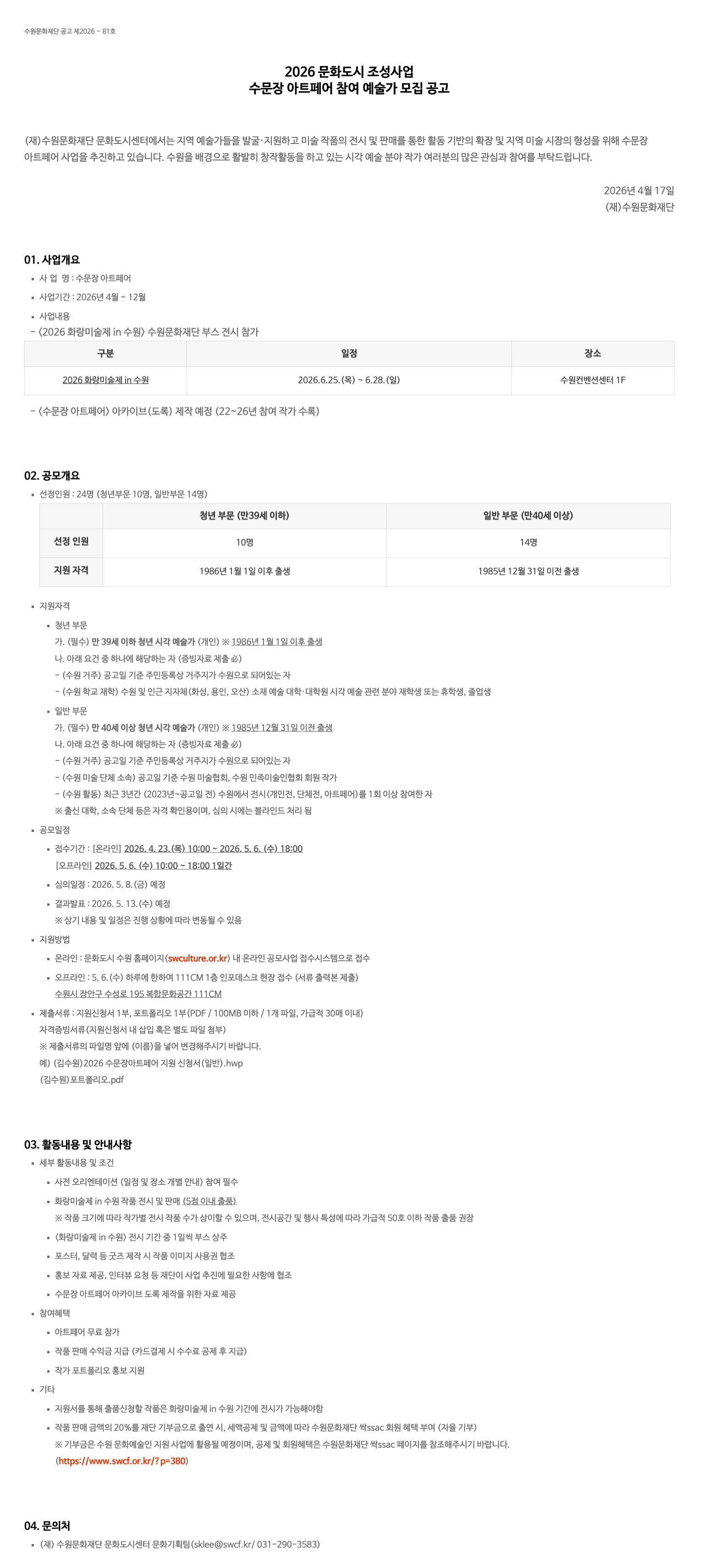 [수원문화재단] 2026 문화도시 조성사업 수문장 아트페어 참여 예술가 모집 공고