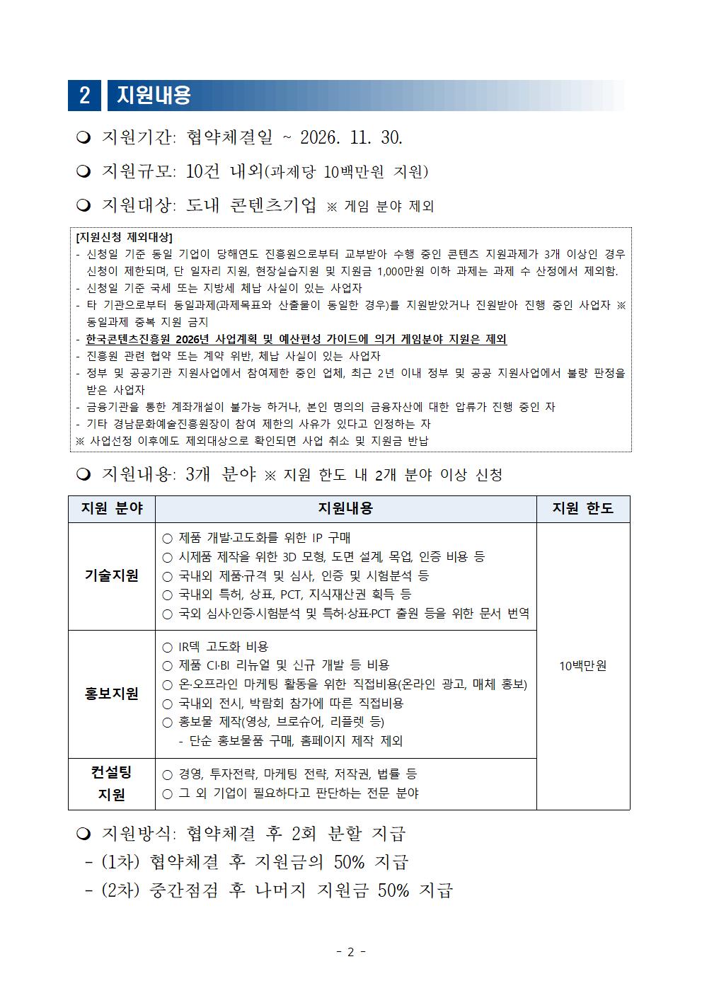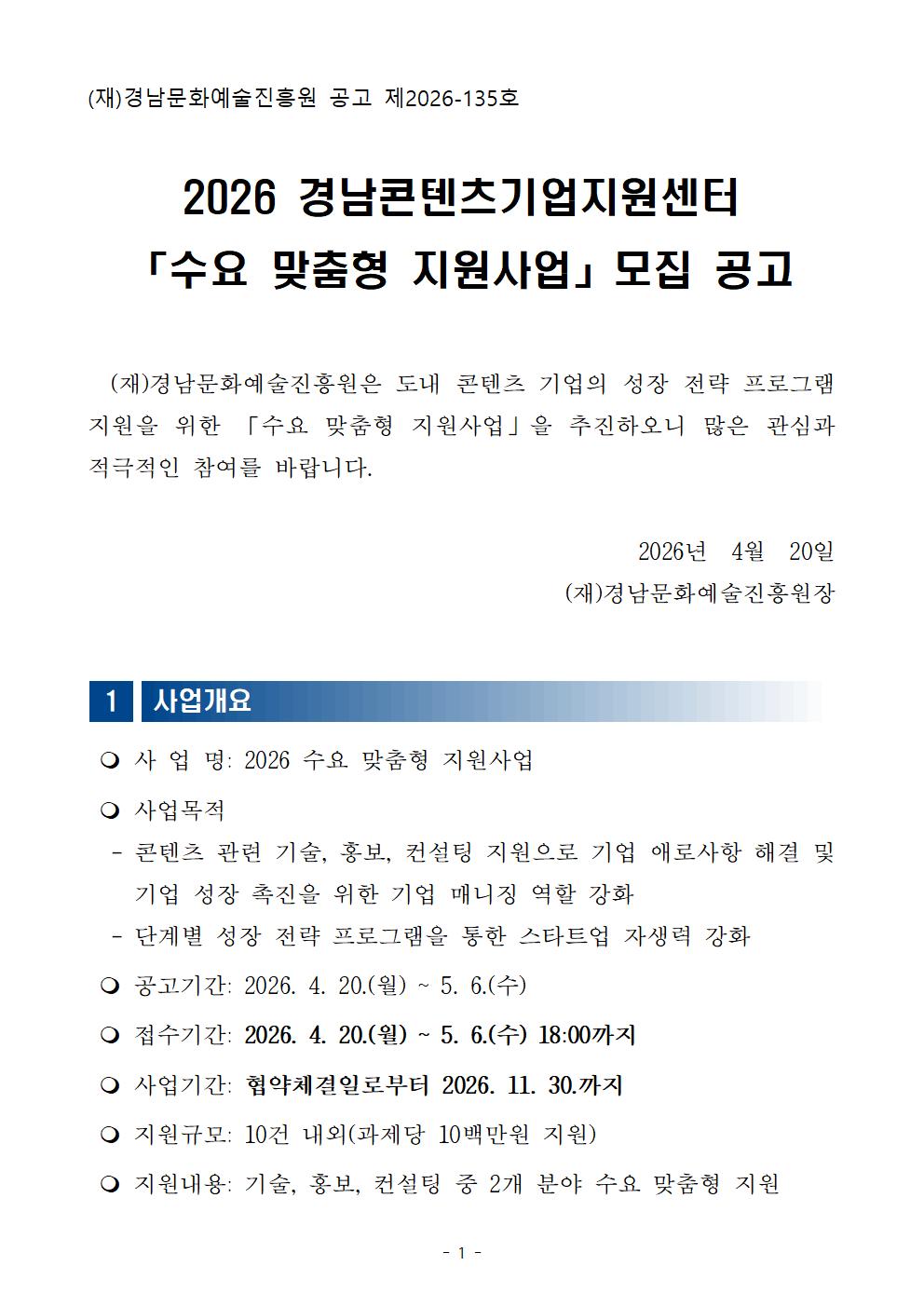 [경남문화예술진흥원] 2026 경남콘텐츠기업지원센터 수요 맞춤형 지원사업 모집 공고